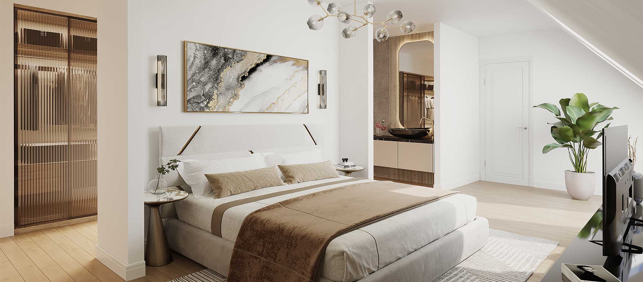 De appartementen met verdieping in Looierskwartier zijn tweelaagse woningen met verschillende mogelijkheden. Eén van de mogelijkheden is om een slaapkamer met inloopkast en ensuite badkamer te realiseren op de tweede woonlaag. Benieuwd hoe dit eruit kan zien? We hebben impressies laten maken om jou een beter beeld te geven.